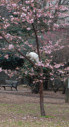 突然、猫は退治するかのごとく、桜の木にのぼり、